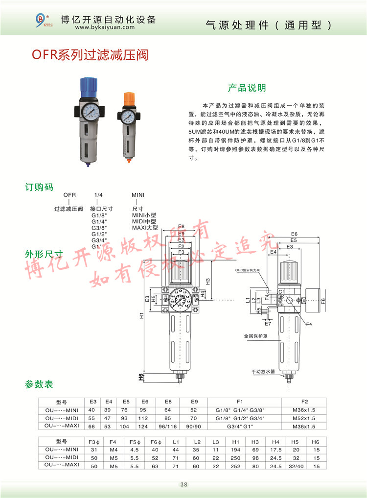 OFR系列過濾減壓閥是把空氣調(diào)壓閥和油水過濾器進(jìn)行組合后的一個(gè)單體雙功能的產(chǎn)品,其主要的尺寸由G1/8到G1寸之間,更多的技術(shù)咨詢請(qǐng)聯(lián)系本公司技術(shù)部:0371-85612788。