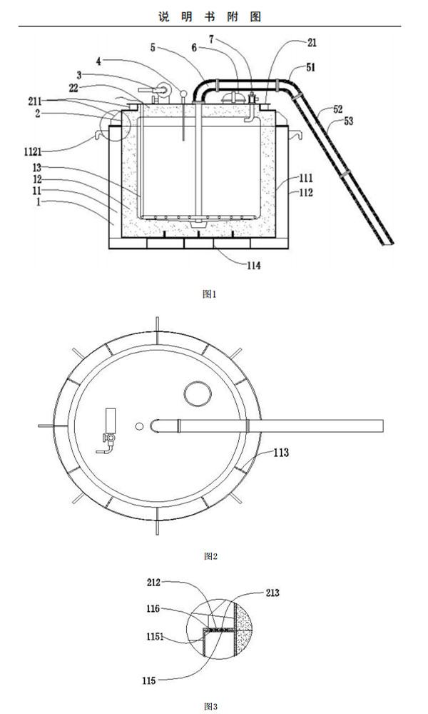 包體1、包蓋體2、引射器3、熱電偶溫度感應(yīng)器4、吸鋁管5、人孔6、進(jìn)氣管7、包板11、包襯12、電加熱組件13、包蓋21、包蓋襯22、加強(qiáng)筋211、內(nèi)包板111、外包板112、加強(qiáng)板113、掛鉤1121、方管114、法蘭邊115、密封圈116、環(huán)形凹槽1151、法蘭邊212、第二環(huán)形凹槽213、彎頭管51、直管52、保溫層53。