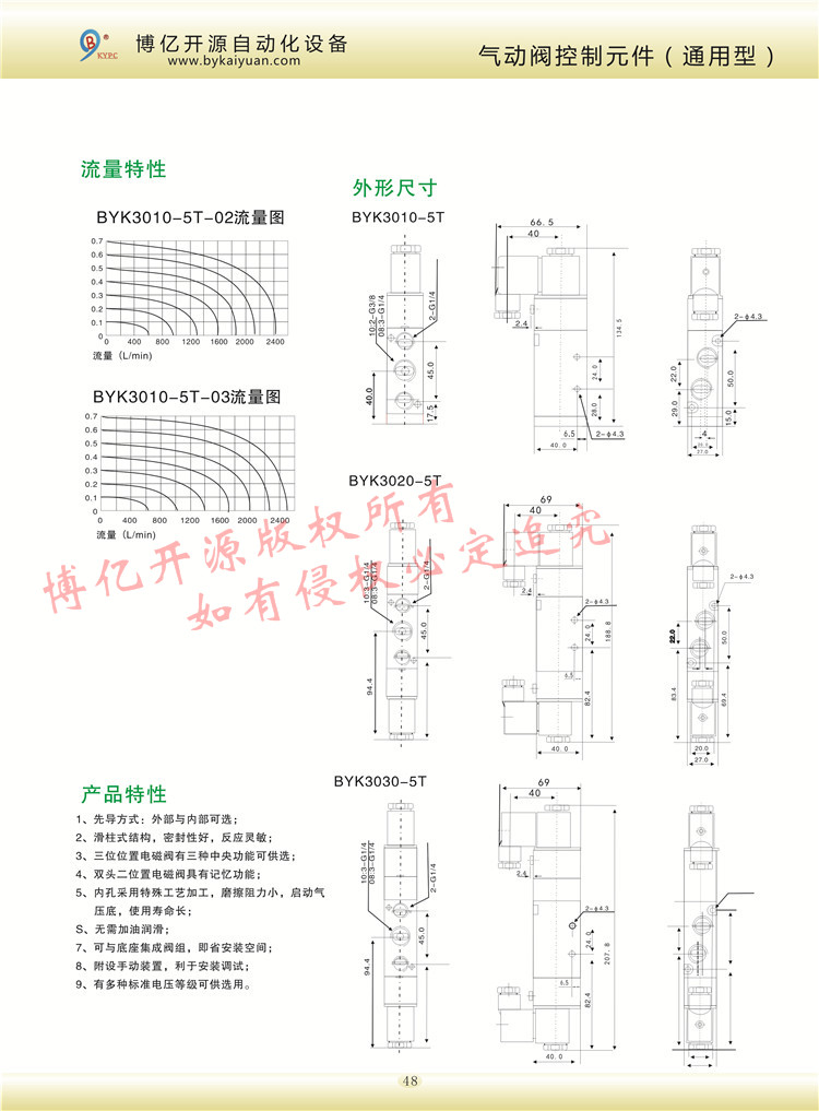 BYK/BYT300系列電控氣控型號有二分接口和三分接口的二位三通、二位五通、三位五通單電控,雙電控的各種電壓控制,更多的技術(shù)咨詢請聯(lián)系本公司技術(shù)部:0371-85612788。