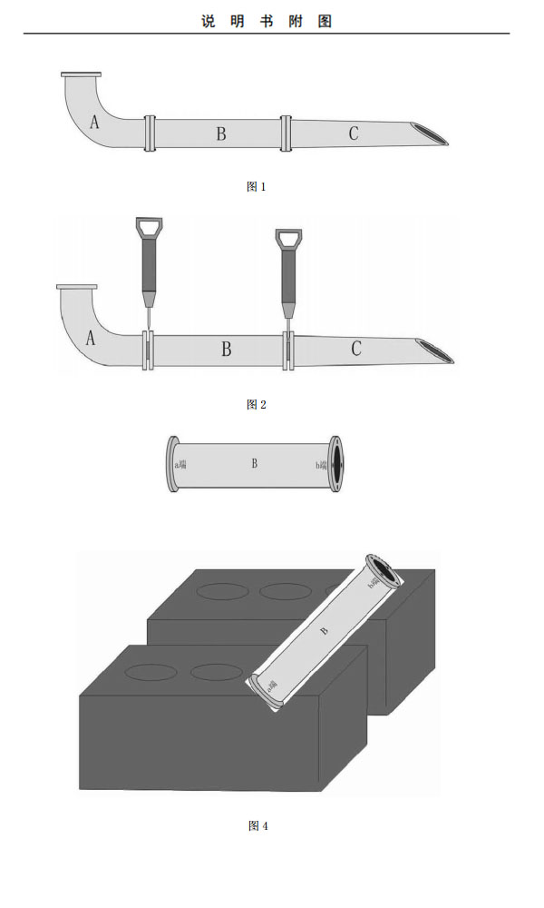 參閱圖 2,首先,將堵塞的每段鋁電解真空抬包吸鋁管的接合處用風(fēng)鎬尖為鏟狀的風(fēng)鎬將 A 段鋁電解真空抬包吸鋁管和 B 段鋁電解真空抬包吸鋁管之間連接處,B 段鋁電解真空抬包吸鋁管和 C 段鋁電解真空抬包吸鋁管之間的連接處打開。